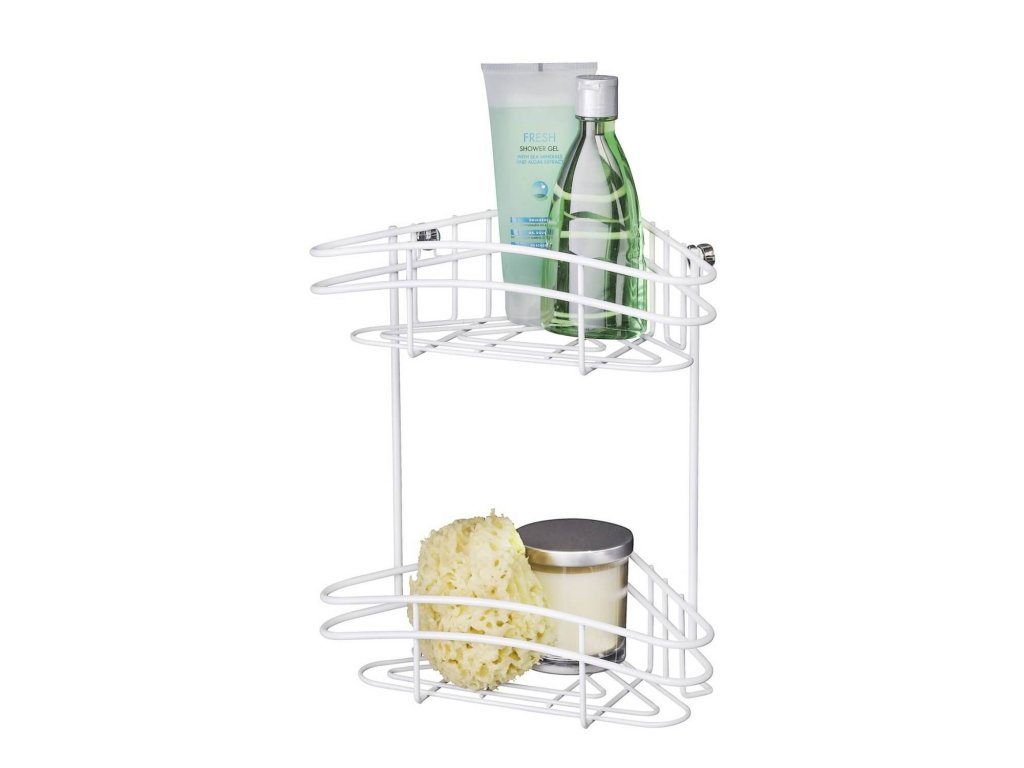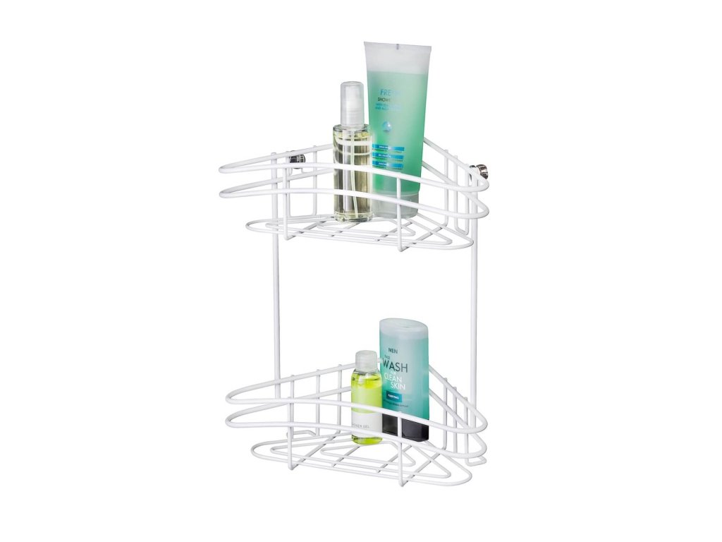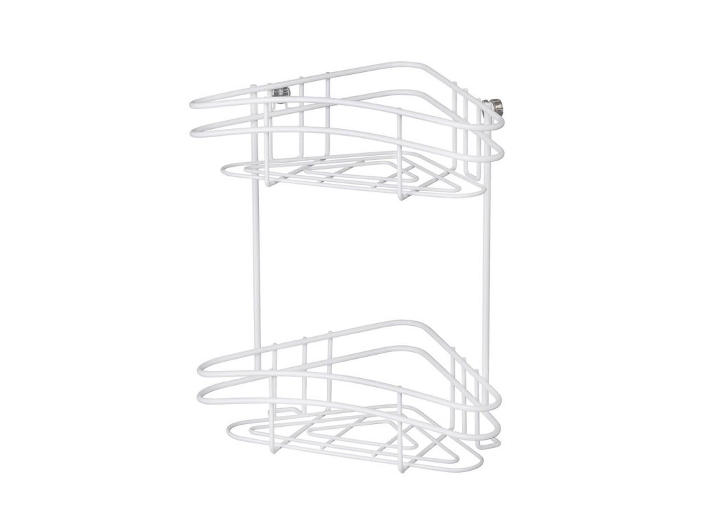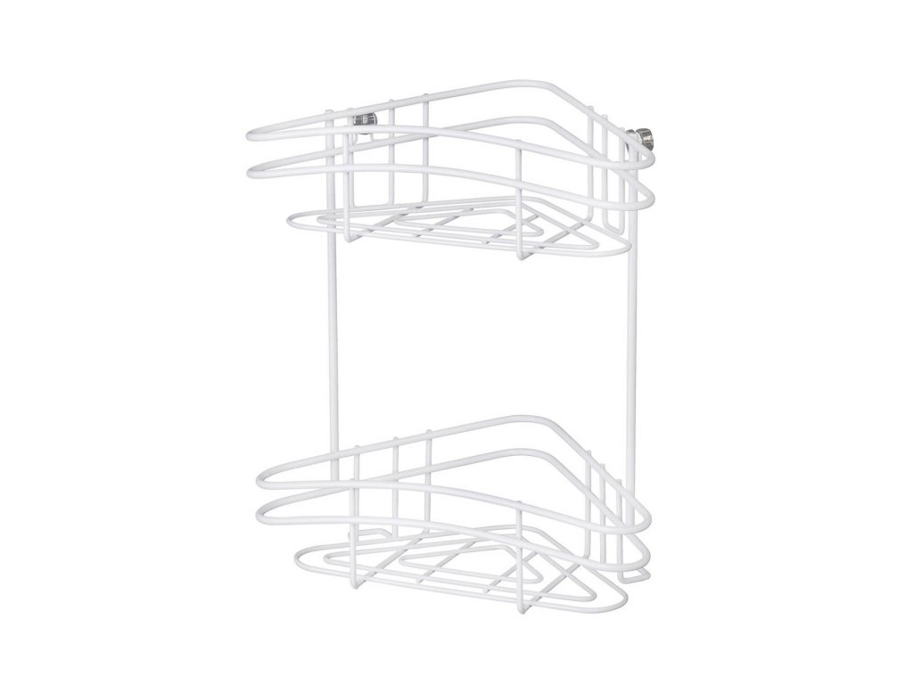 Prostorově úsporný rohový regál Classic Plus se dvěma patry z lakované oceli nabízí optimální využití úložného prostoru v koupelně.