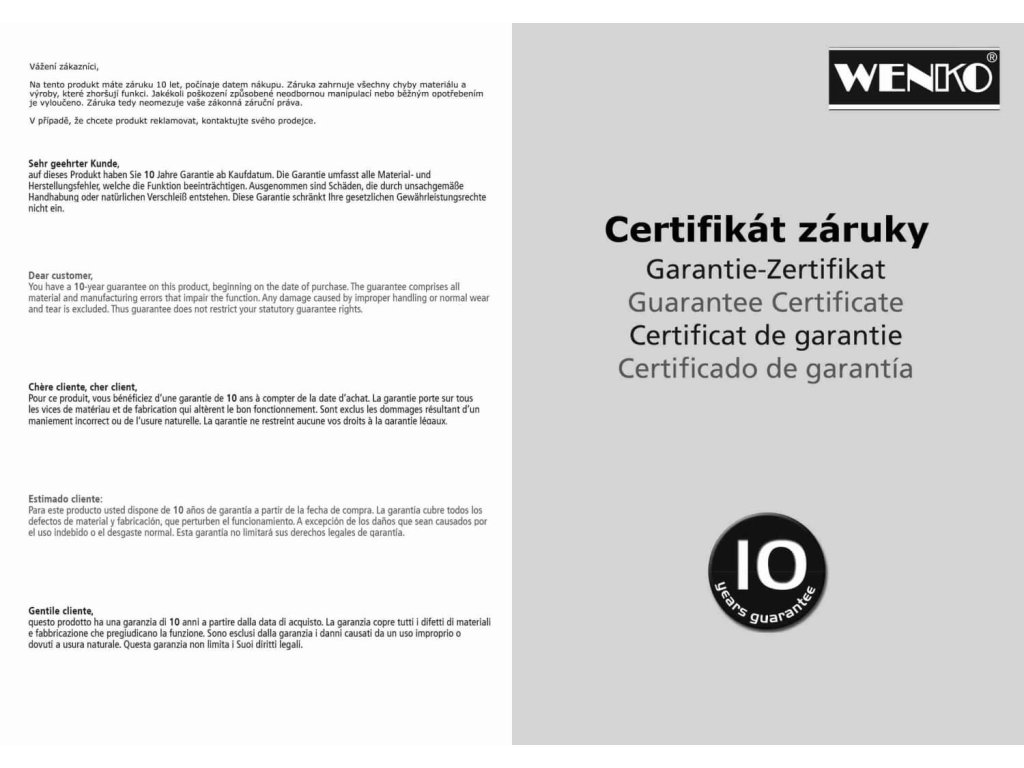 Na tento výrobek máte od výrobce danou záruku po dobu deseti let. Záruka zahrnuje všechny materiálové a výrobní chyby, které zhoršují funkci. Poškození způsobená nesprávným zacházením nebo běžným opotřebením jsou vyloučena.