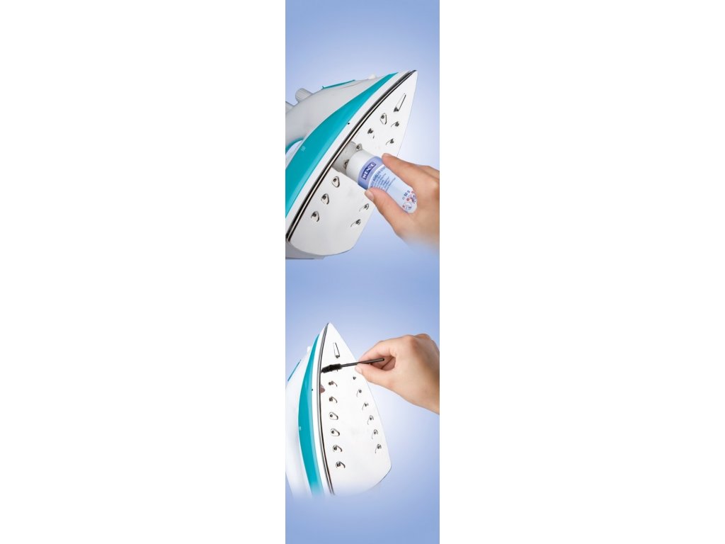 Praktická čisticí sada skládající se z čisticí tyčinky a kartáče usnadňuje rychlejší a snadnější žehlení. Díky čisticí tyčince je žehlička rychlejší a zlepšuje se její kluznost. Neobsahuje mastné kyseliny, včelí vosk a rozpouštědla. Speciální kartáček optimálně čistí parní trysky.