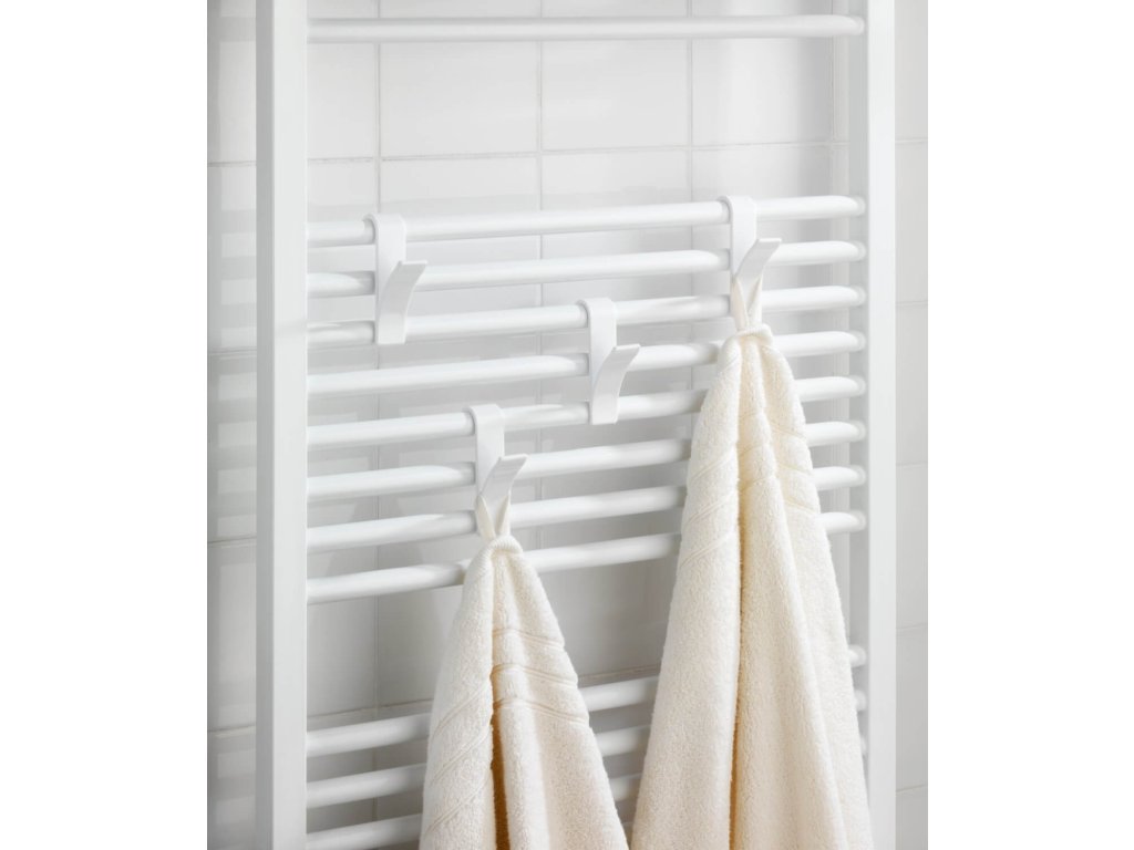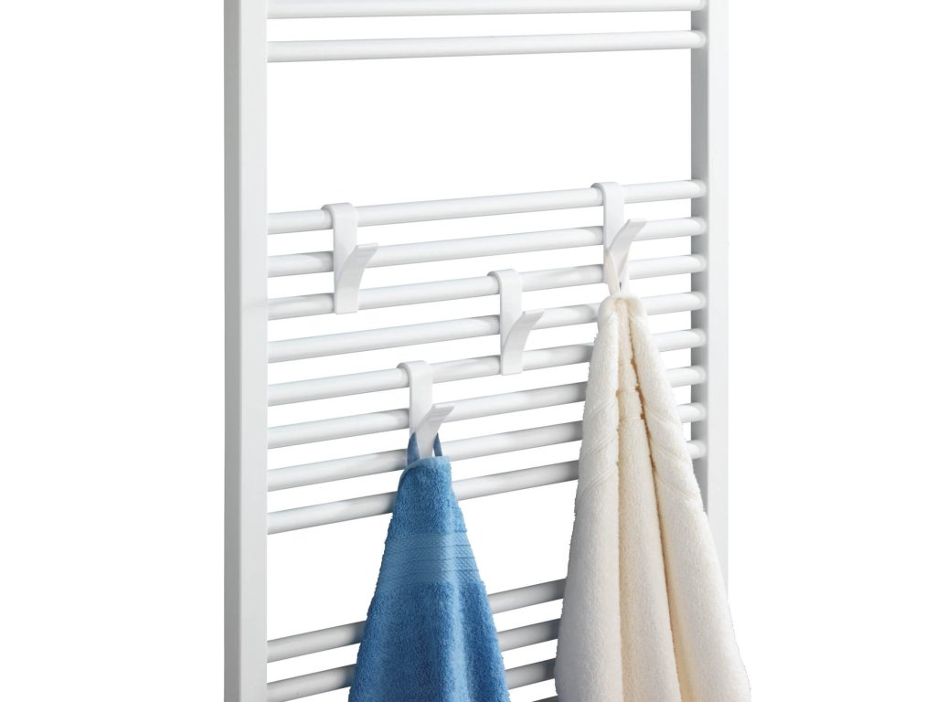 Háčky se jednoduše zavěsí do tyčí ohřívače ručníků. Ať už jsou připevněny vedle sebe nebo v různých výškách, udržují ručníky na požadovaném místě ve snadném dosahu.